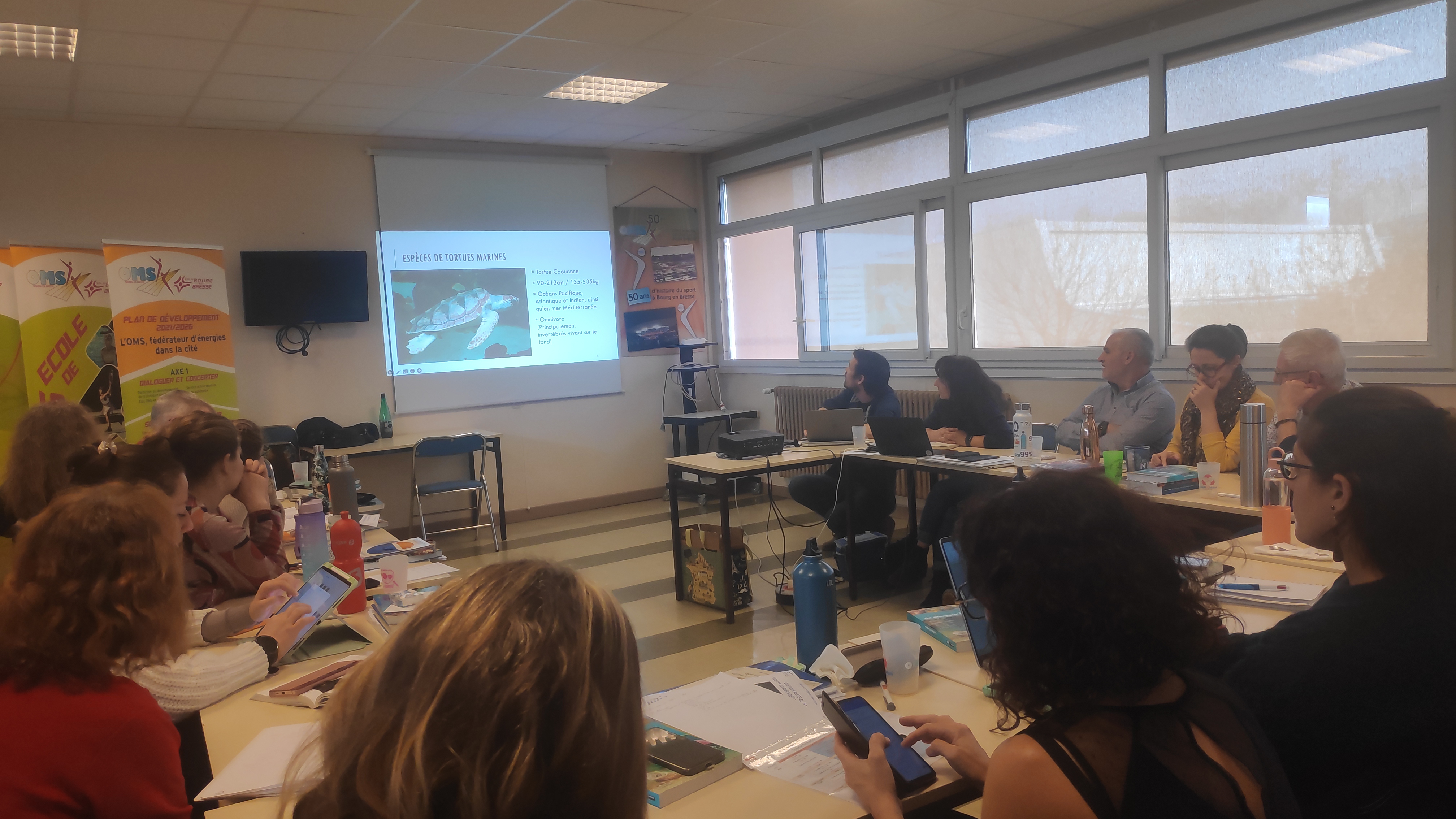 Après une collation pour bien débuter la matinée et échanger les dernièrs nouvelles subaquatiques, les stagiaires s’attellent à un questionnaire portant sur les connaissances de la journée n°2. C’est l’occasion de remobiliser les acquis, et de s’interroger sur quelques mots compliqués (quelle différence entre coanocytes et pinacocytes? à vos dictionnaire ! ). Après le débriefing commun animé par Gil, les stagiaires se mettent en groupe pour préparer, selon une méthode qu’ils ont déjà mise en application lors de la 2ème journée, de petites présentations synthétiques des familles suivantes : Crustacés, Echinodermes (les étoiles de mer par exemple), Tuniciers (ascidie rouge par exemple), et enfin les poissons cartilagineux et osseux. À l’aide de powerpoint illustrés (parfois grâce à des vidéos personnelles !) les groupes (PB2 et PB1 en association!) expliquent à leurs camarades comment se caractérisent chaque famille, comment les animaux se développent, se nourissent, et où un plongeur attentif pourra les trouver. C’est aussi l’occasion de poser des questions auxquelles les formateurs se font un plaisir de répondre, sur le moment ou à l’occasion de leur propres présentations.